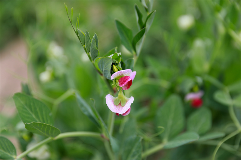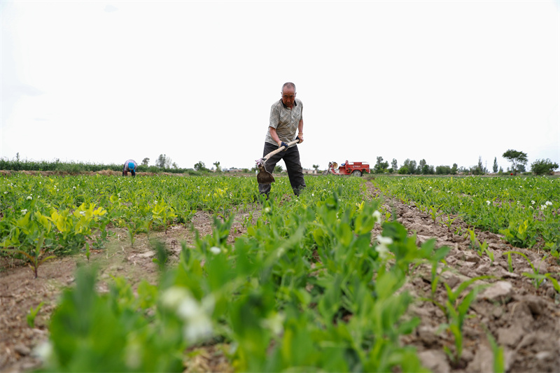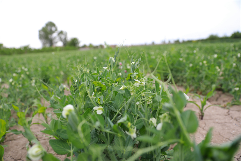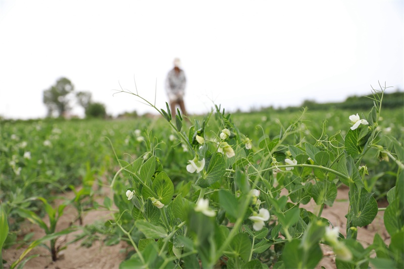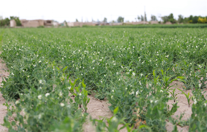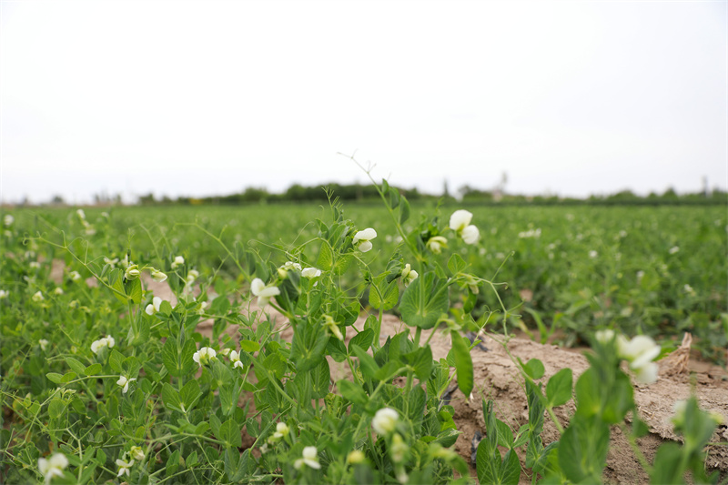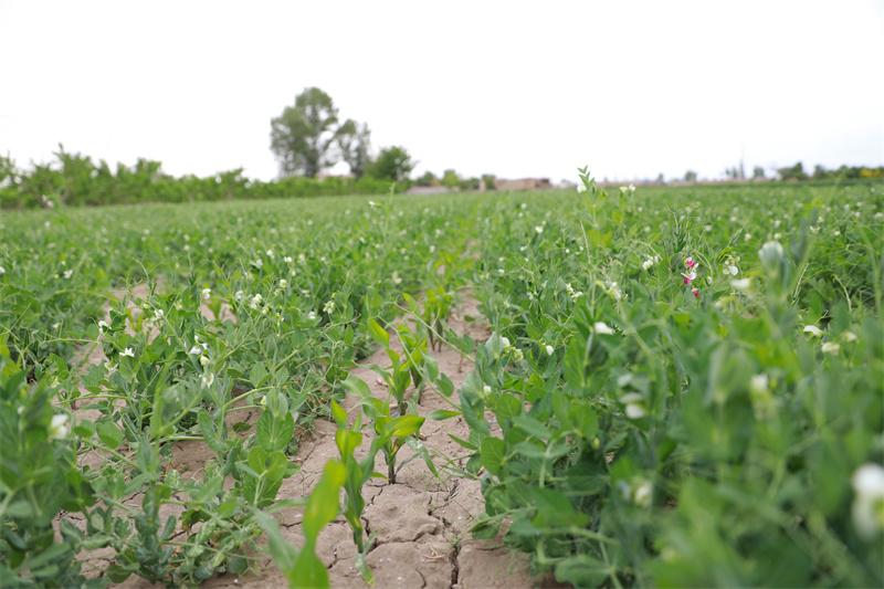 金塔县金塔镇边沟村的田地上,村民在田埂间锄草、松土,为豌豆提供良好生长环境,田间地头一派忙碌的景象。